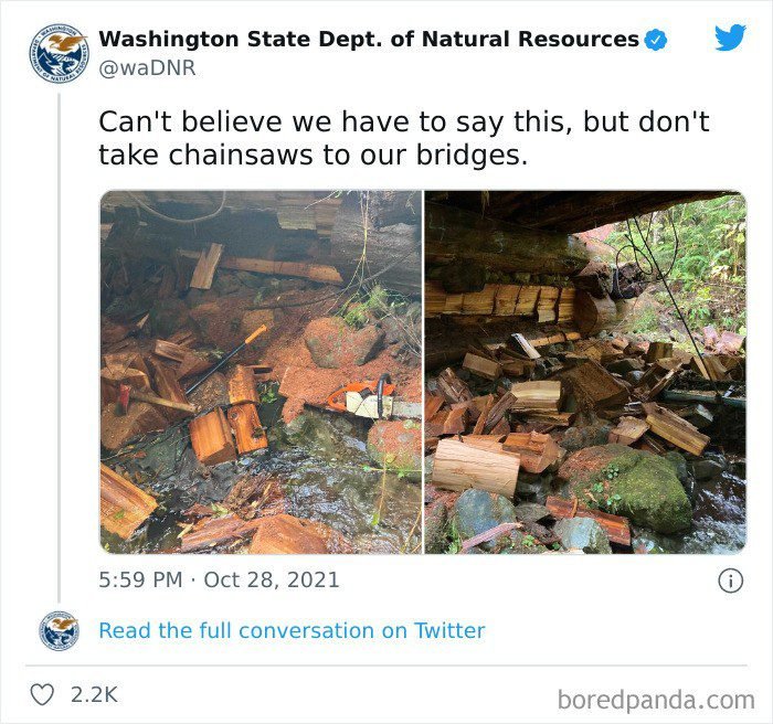 12 – “Alguém levou uma motosserra para a base de cedro de uma ponte em uma floresta para vender o cedro no mercado negro”