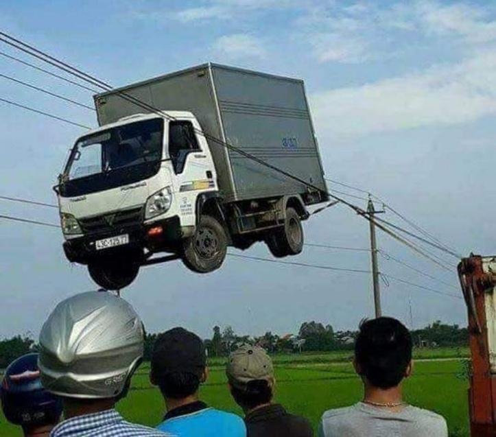 7. Esta imagem mostra um caminhão está preso em cabos dos postes.