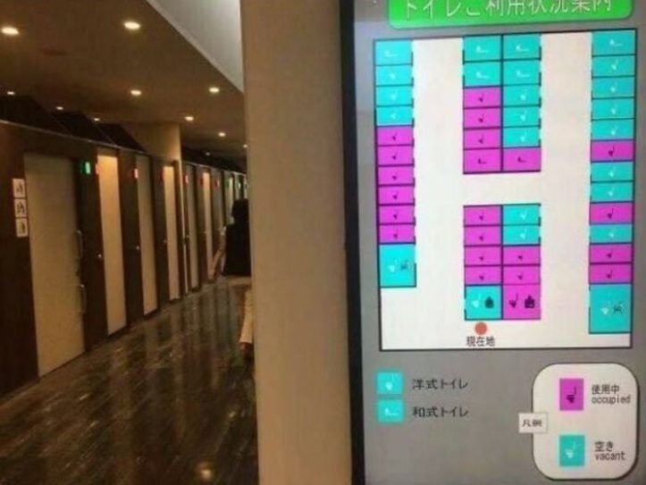 8. Alguns banheiros possuem mapas eletrônicos que mostram quais boxes estão ocupados.