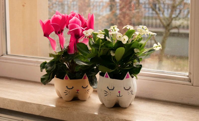 4.2. Pinte com spray o pedaço de plástico que você cortou e desenhe o rosto de um bichinho (escolhemos gatinhos). Agora você tem um vasinho de planta fofo e customizado.