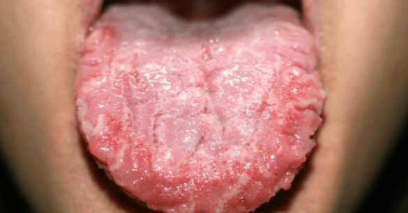 Nesse caso, a língua apresenta manchas lisas e avermelhadas, circundadas por bordas brancas.