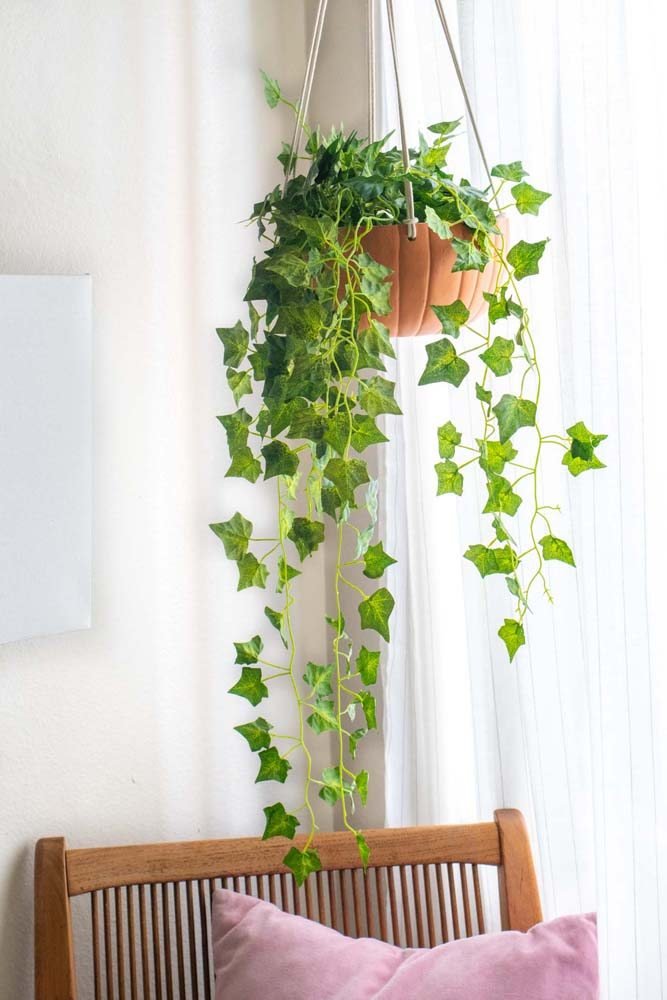 A Hera-inglesa é uma planta trepadeira que pode ser usada para cobrir paredes ou crescer em vasos suspensos. Além de absorver umidade, ela também purifica o ar.