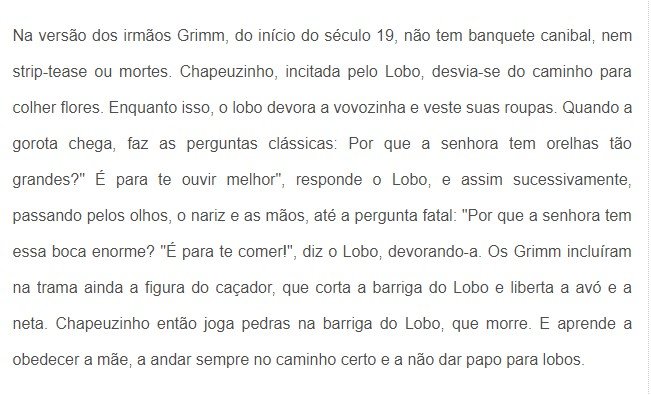 Mas, e se o lenhador não tivesse chegado a tempo de socorrer a Chapeuzinho e salvar sua avó do Lobo Mal e a história tivesse um outro final, como por exemplo, a menina fosse obrigada pelo Lobo Mau a beber o sangue de sua avó antes que ele à devorasse, certamente você ficaria horrorizado, e não teria também coragem de contá-la a seus filhos.