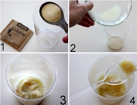 1 Misture a gelatina sem sabor com o leite, em temperatura ambiente, misturando bem até virar uma massinha