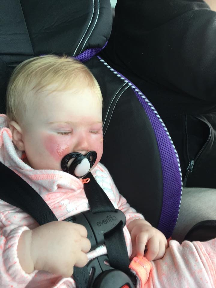 Rebecca contou que na embalagem do protetor estava escrito que ele não era recomendado para bebês menores de seis meses. Como sua filha já tinha 14 meses, Rebecca não pensou que fosse um problema. “Mas não deu certo. O rosto dela começou a ficar cada vez mais vermelho e o dia nem estava com tanto sol.