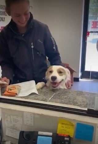 Ele continuou abanando o rabo e ansiosamente agarrou-se à mesa da recepção como se estivesse apressando a assinatura de todos os documentos para sair rapidamente com sua nova família.