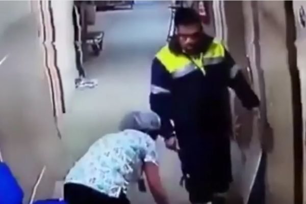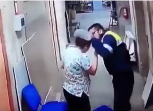 Ainda antes de chutar a barriga da mulher ele a segura pelo cabelo e bate sua cabeça contra uma porta.