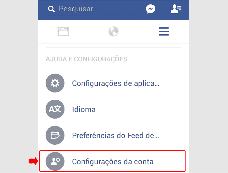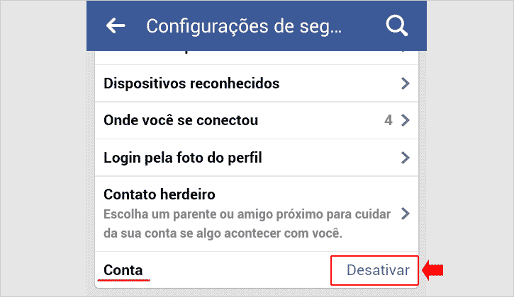 Passo 5 – Role as opções de segurança de sua conta do Facebook para baixo até o final, agora, toque à direita da última opção Conta, em Desativar.