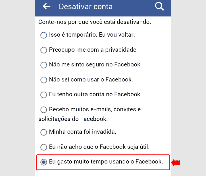 Passo 6 – Na tela seguinte, você será questionado se tem certeza que deseja desativar a sua conta e terá mais algumas informações sobre o que ocorrerá ao desativar o perfil. Mais abaixo, será necessário marcar uma das opções disponíveis informando o por que você está desativando o perfil. Selecione a opção de acordo com a sua situação. Nesse exemplo do tutorial, marcaremos a opção Eu gasto muito tempo usando o Facebook.