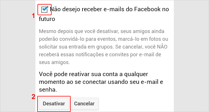 Passo 8 – Após ignorar a notificação, deslize para baixo e você verá mais algumas opções. Terá uma caixa de seleção com a opção Não desejo receber e-mails do Facebook no futuro. Caso não queira receber e-mails com notificações sobre essas atividades do Facebook enquanto a sua conta estiver desativada, marque essa opção e toque no botão Desativar.