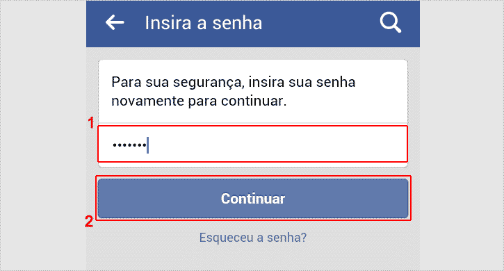 Passo 9 – Por questões de segurança, poderá ser solicitado a senha de sua conta do Facebook para concluir desativação do perfil. Caso apareça essa tela solicitando a senha de sua conta, informe a senha atual e toque no botão Continuar, caso contrário, avance para o próximo passo.
