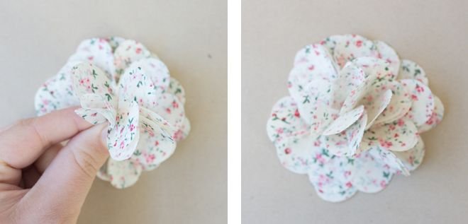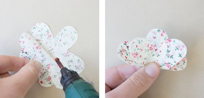 Cole os avessos das flores com uma gota de cola quente no meio e em cada pétala. Dobre cada peça do meio, também colando.