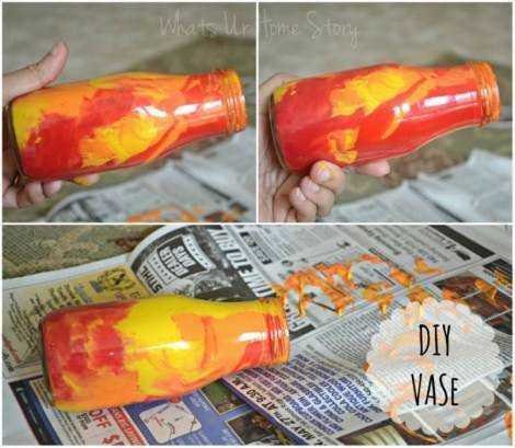 Em seguida, pegue o spray de tinta e pinte o pote, da primeira faixa até seu final. O jornal vai servir para evitar manchas.