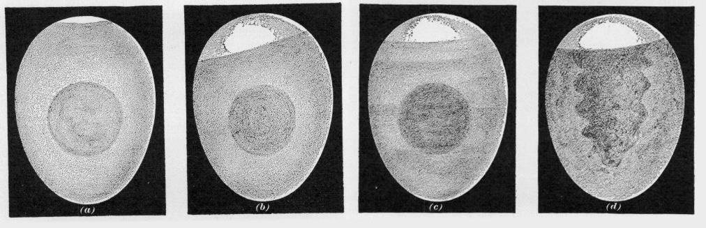 Na foto, acima você pode ver um ovo fresco (pouco espaço aéreo, gema ligeiramente visível), um ovo ligeiramente velho (maior espaço aéreo, gema levemente mais escura), um ovo quase ruim (gema muito escura, irregular) e um ovo estragado: gema extremamente escura).
