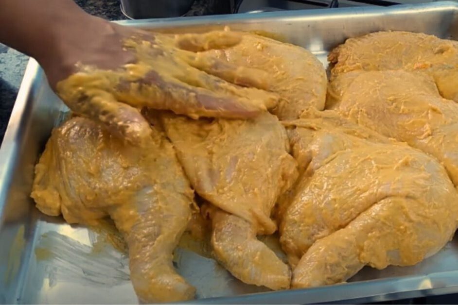 Enquanto o frango está marinando, pré-aqueça o forno a 200°C.