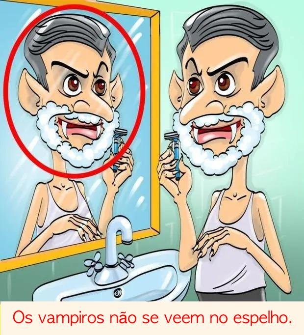 Na ilustração você pode ver o vampiro se barbeando no banheiro de sua casa. Para resolver este desafio, é necessário ver com clareza cada detalhe minucioso que pode ser identificado e aí analisar se o uso que se dá é adequado.