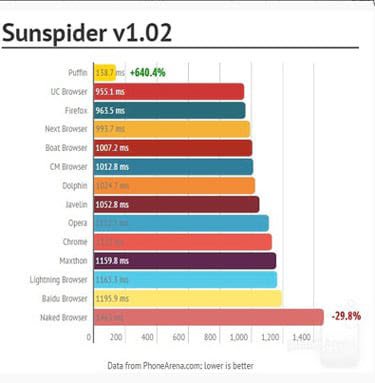 - O Puffin saiu muito bem no teste feito pelo Sunspider, terminou a avaliação em apenas 138,7ms.