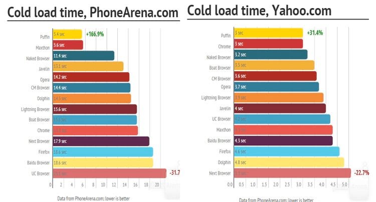 Para fazer esta medição a equipe do PhoneArena usou o Google Nexus 6, com o Android 5. O primeiro teste foi realizado com benchmarks que medem o tempo que cada navegadores levam para processar todas as solicitações do usuário, bem como lidar com todo o conteúdo HTML e exibir a página na tela do dispositivo.