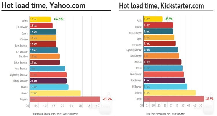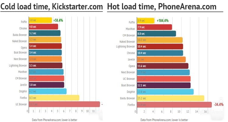 O Puffin foi o navegador que apresentou melhor desempenho, nos benchmarks.Provavelmente porque, o seu processamento é remoto. Ou seja, quando você acessa um site, o conteúdo é processado nos servidores da empresa e após enviado para o seu smartphone.Este navegador pode ser uma boa opção para celulares com hardwares mais modestos.
