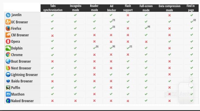 - O que mais se mostrou completo neste aspecto foi o UC Browser, contando com suporte à sincronização de abas, modo anônimo, modo de leitura, bloqueador de propagandas, suporte a flash, modo tela cheia, compressor de dados e buscador integrado de conteúdo.