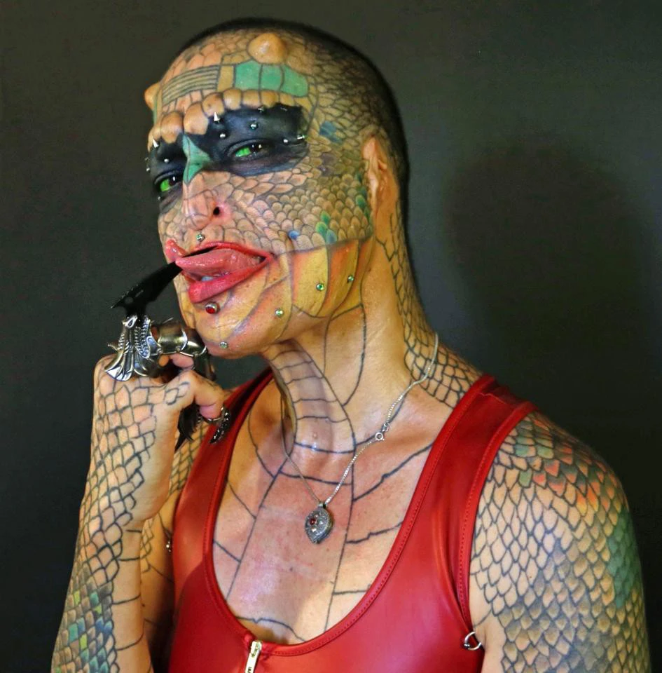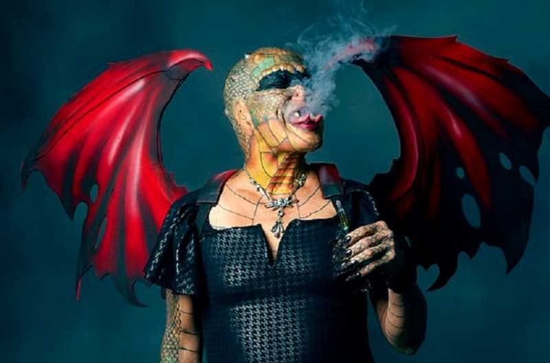 É o caso de Tiamat Eva Medusa, uma mulher transgênero do Arizona, EUA, que ficou conhecida nas redes sociais por suas modificações corporais que se assemelham a um dragão.