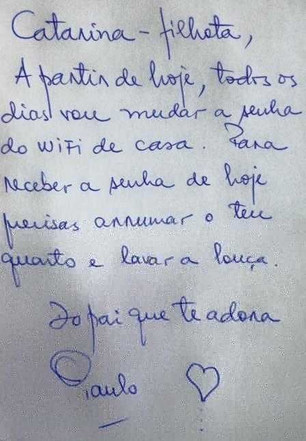 Ele escreveu o bilhete à mão, publicou na página da filha no Facebook e, em cinco minutos, ela respondeu com duas fotos: uma da pia sem louça e outra do quarto arrumado. Ele, então, liberou a senha.