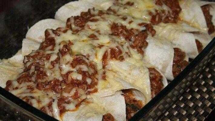 - Recheie a panqueca com uma fatia de mussarela, uma porção de carne e enrole