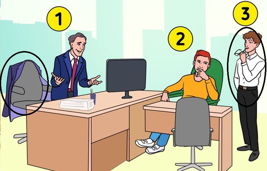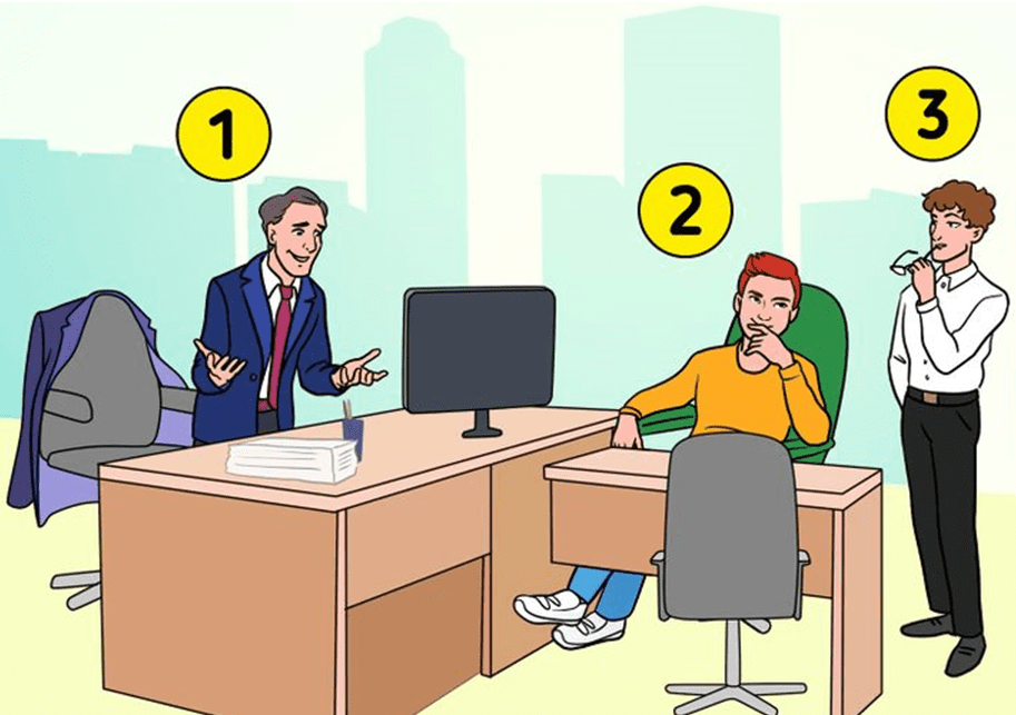 RESPOSTA: O blazer ou casaco do chefe está na cadeira. Então, o chefe é o número 3 que está sem paletó.