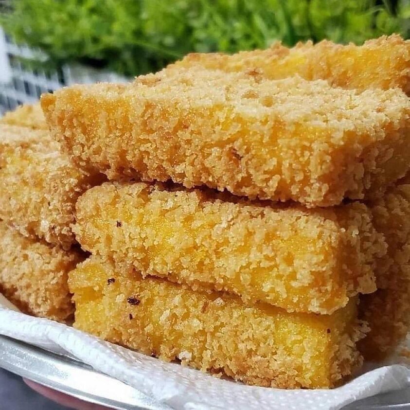 Quando estiver frio, corte em formato de palitos grossos, passe na farinha de rosca e frite em óleo bastante quente.