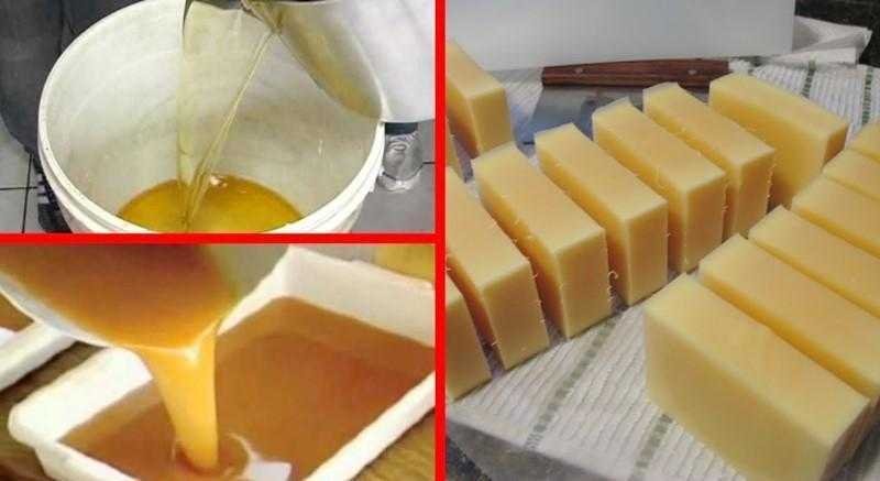 – Depois de pronto, forre uma caixa de papelão não muito grande, despeje o sabão e depois de frio, corte-o em barras.