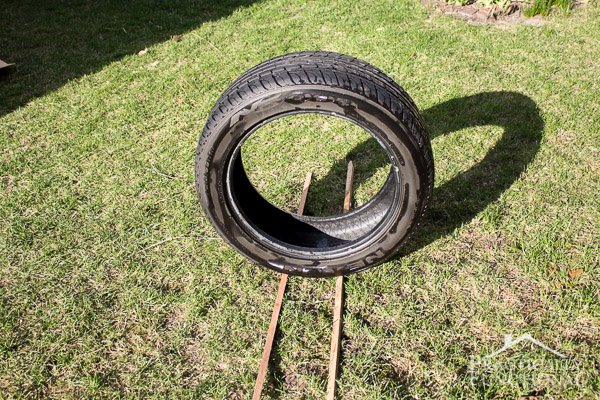 Agora é só deitar o pneu no chão e colocar a almofada redonda dentro dele.