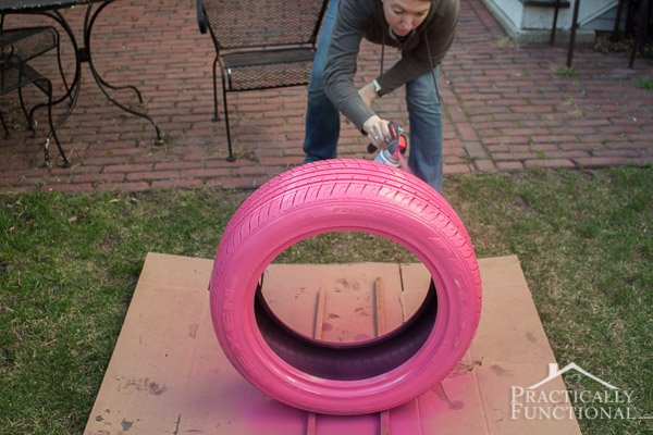 Passado o tempo necessário, pinte o pneu todo com a tinta spray da cor que desejar e esperar secar.