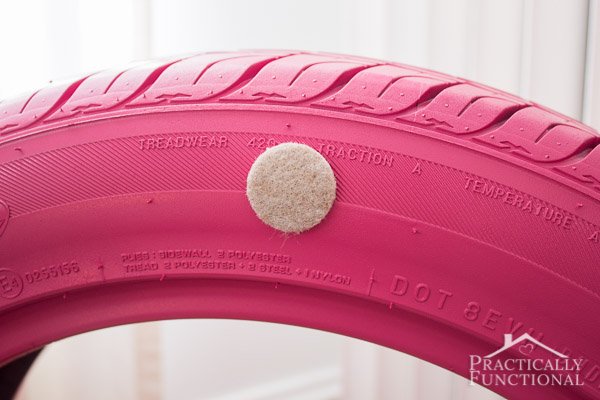 Num dos lados do pneu (justamente o que ficará em contato com o chão) coloque os adesivos de feltro para proteger a pintura.
